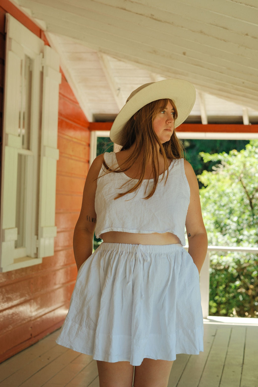 A bouncy, flowy skirt with an elastic waist, mini length and a drawstring, and deep pockets.