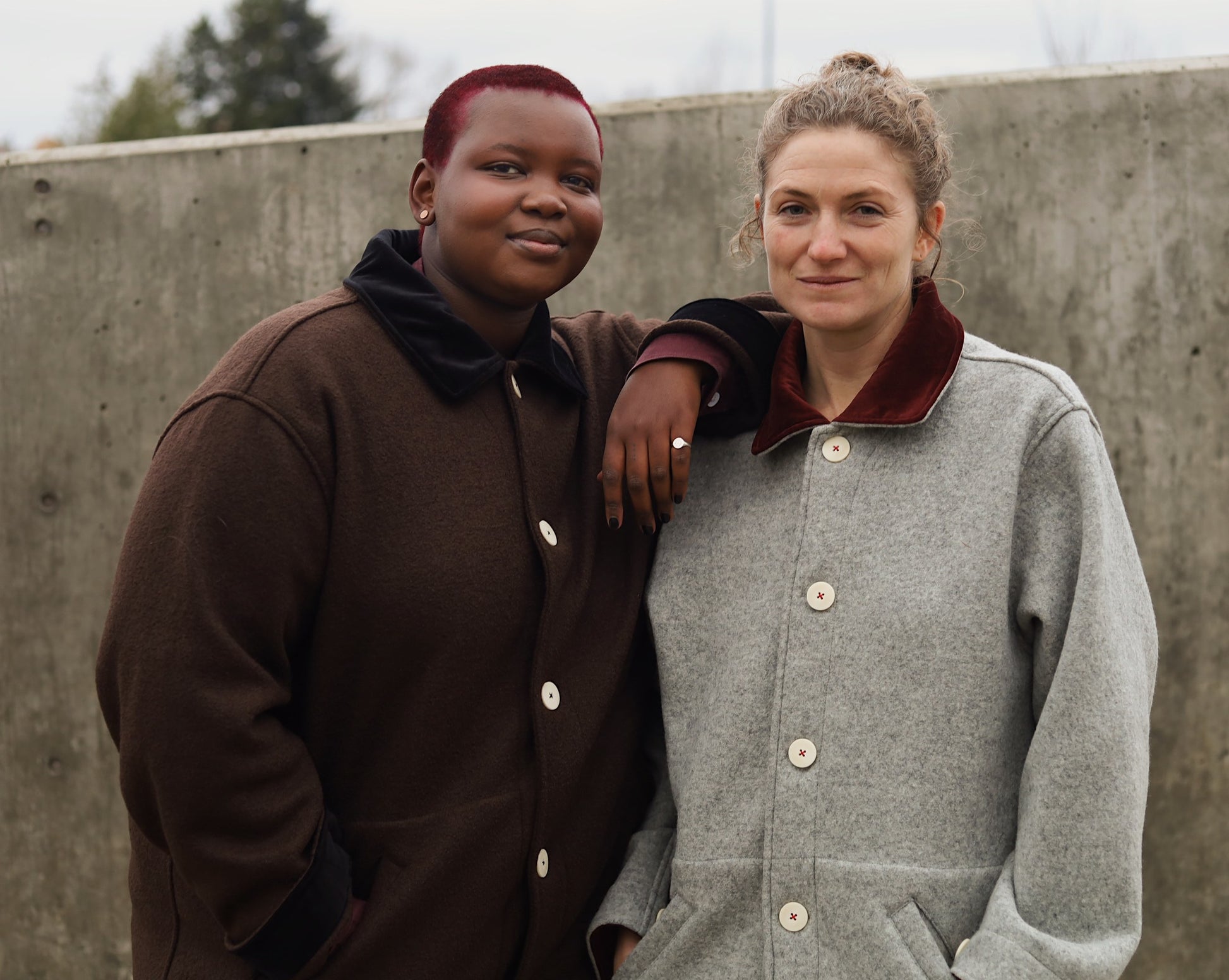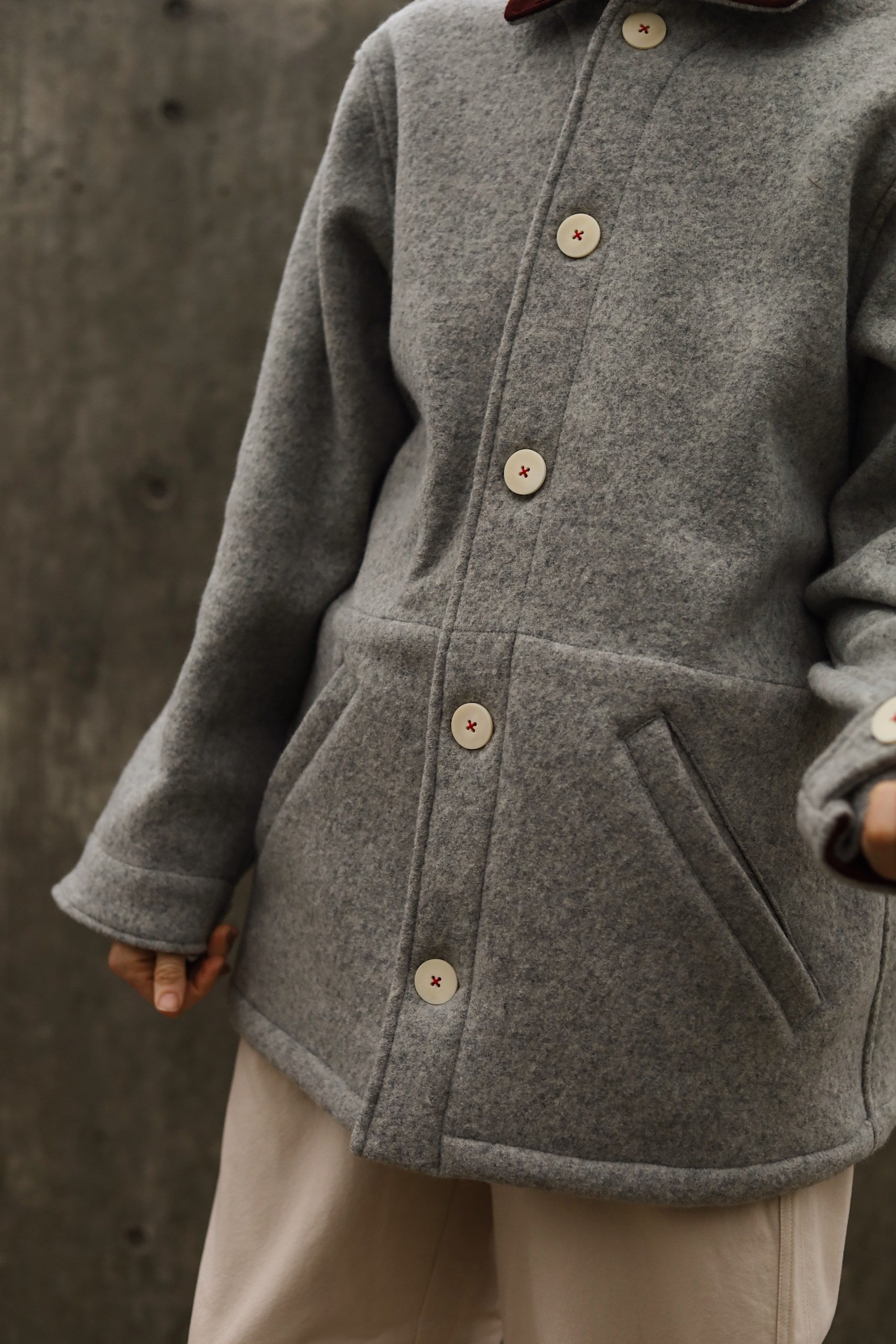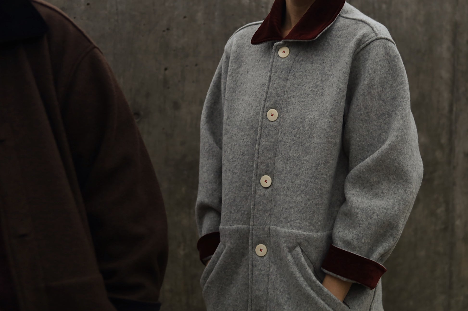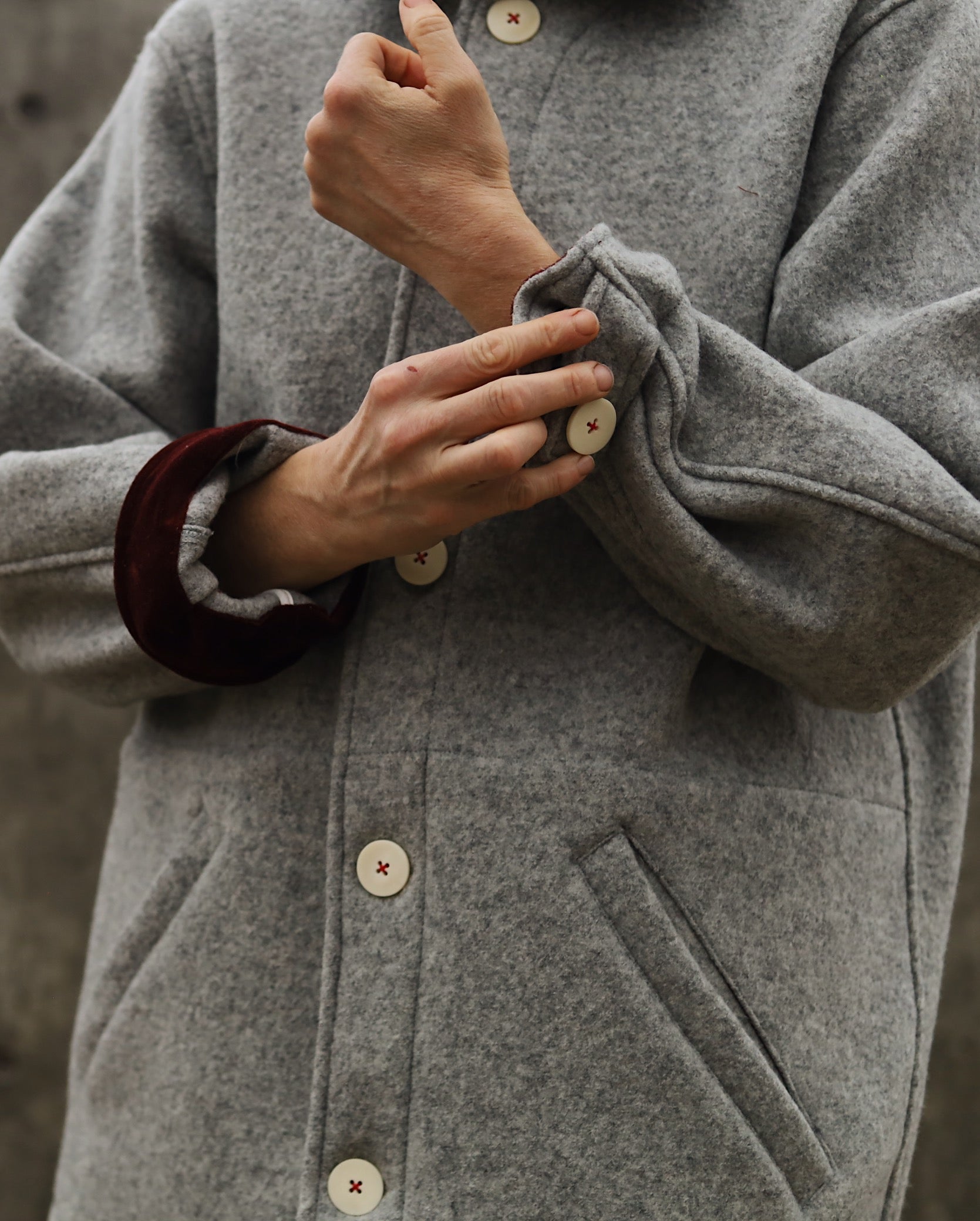 This coat features deep, functional pockets and a rich cotton velvet trim at the collar and cuffs, adding a soft contrast and elevated finish. It’s an easy, timeless silhouette that layers beautifully over anything—from lightweight tops in fall to cozy knits in the winter.