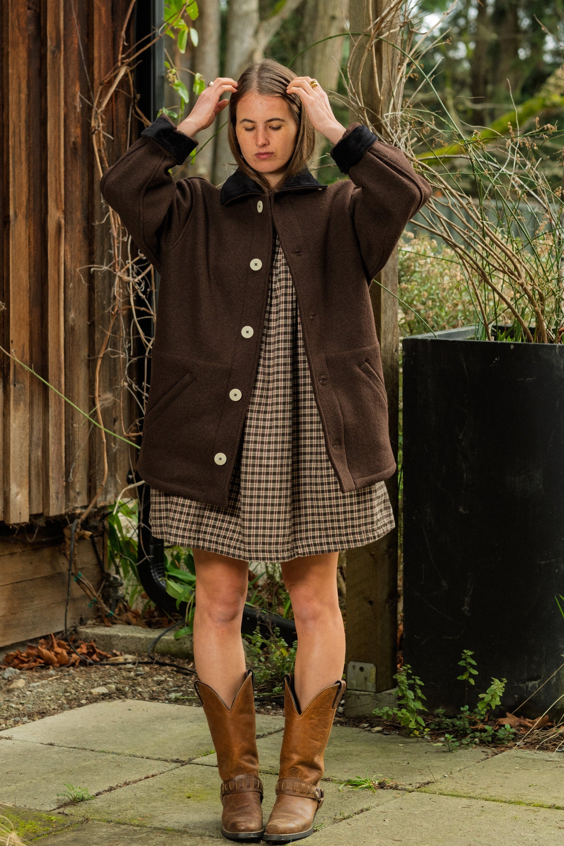 The oversized fit is perfect for west coast layering. Quality of fabric and construction was superb, and the little details like the cuffs and collar are just that extra touch. Buttons are sturdy and thick, useful for a wool coat! Really can’t recommend it enough, very hard to find a 100% wool coat made in Canada!